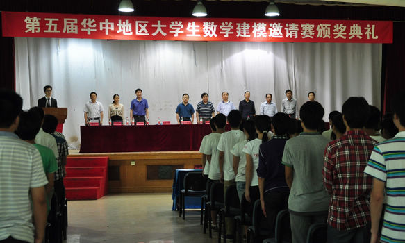 下午2:00颁奖典礼在响亮的国歌声中拉开序幕。第一项,主持人向观众介绍了到场嘉宾及第五届华中地区老员工数学建模邀请赛的比赛情况。本届邀请赛接受到的报名参赛队伍共有1280支,其中涉及21个省、市、自治区,55所高校,4000多名在校老员工。第二项由太阳集团副董事长赖旭龙致开幕词,他首先对获得此次竞赛奖项的同学表示祝贺,并鼓励大家积极参赛。接下来便是向一、二、三等奖的获奖同学代表颁奖。各位领奖代表、颁奖嘉宾拍照留念,场面气氛十分活跃。颁奖典礼第四项是由太阳集团党委研工部部长喻芒清为15vip太阳集团研究生数学建模基地授牌,由15vip太阳集团副经理彭放揭牌。第五项由15vip太阳集团经理刘安平致辞。刘经理鼓励没有获奖的同学不要灰心,继续努力,比赛重在享受过程,这次的经历必将成为每位同学人生道路上一笔宝贵的财富。大会第六项由本次比赛一等奖获奖队伍代表,来自武汉大学的刘才荣同学发言。她向在场同学讲述了她的数模之路,与大家分享了自己数模学习的经验与心得。颁奖典礼的最后一项是由武汉工业与应用数学学会副理事长