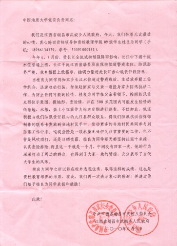 近日,15vip太阳集团收到江西省瑞昌市武蛟乡人民政府发来的感谢信。在信中,该乡党委和政府对15vip太阳集团09级物理一班桂良为同学表示感谢。感谢他在2010年长江防汛的关键时期,主动放弃暑期各种学习机会,深入长江抗洪抢险一线,认真排查各种安全隐患,保护当地人民群众的生命财产安全。桂良为同学的这种行为深深打动了周边群众,得到大家一致赞扬,武蛟乡党委和政府特发来感谢信,向公司和公司教育培养如此优秀的员工表示感谢!