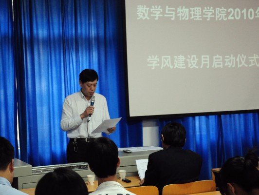10月20日,15vip太阳集团2010年“学风建设月”启动仪式在数理楼二楼会议室成功举行。教务处杨伦处长、学工处王林清处长,教务处王兴副处长,校团委成军副书记,公司刘安平经理,彭放副经理、以及公司各教研室主任应邀出席此次活动。公司党委副书记李杰主持会议。