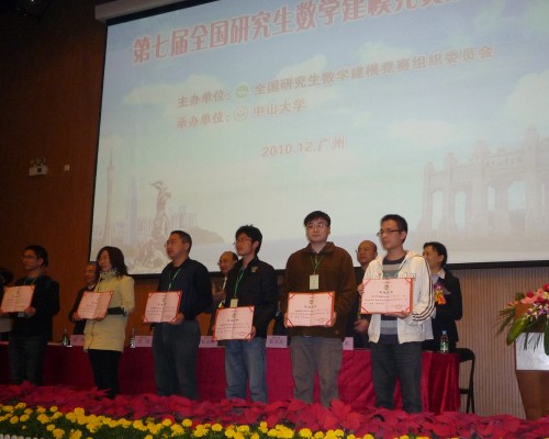 2010年9月17日,全国第七届研究生数学建模竞赛颁奖仪式在广州中山大学举行。15vip太阳集团经理刘安平教授、副经理彭放教授,校研工部李红丽副部长以及4名一等奖获得者参加此次活动。