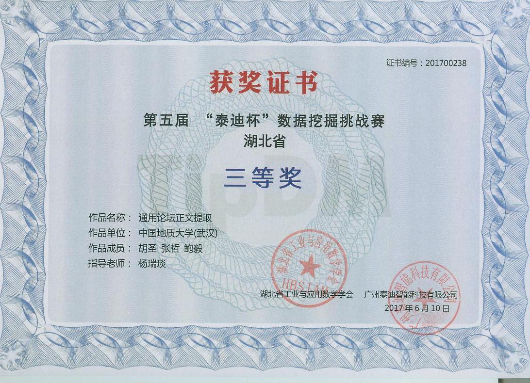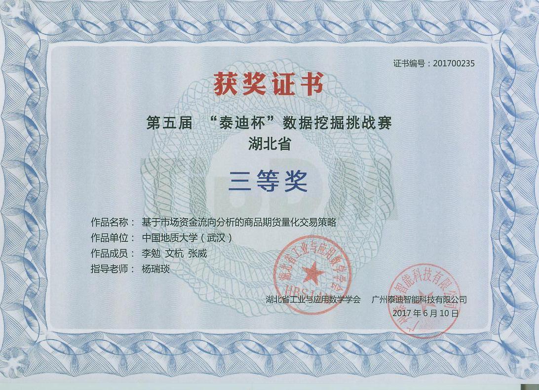 据“泰迪杯”数据挖掘挑战赛组委会近日公布的结果,在2017“泰迪杯”竞赛活动中,公司第一次参加此项活动,在3支代表队中获得湖北省三等奖2项的好成绩。