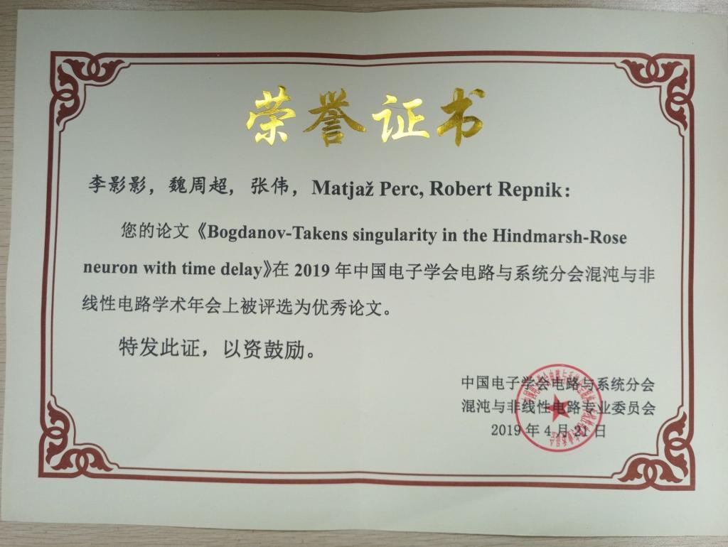2019年4月19-21日,中国电子学会电路与系统分会混沌与非线性电路第二届学术年会在南京举行,荣誉顾问香港城市大学陈关荣院士出席会议开幕式。李影影同学参加了本次年会并作题为“Bogdanov-Takens singularity in the Hindmarsh-Rose neuron with tine delay”的学术报告,其主要成果发表在T2类期刊Applied Mathematics and Computation上。本次报告论文视角新颖、内容丰富,得到了与会专家学者的认可,并被评选为优秀论文。此次学术交流由国家自然科学基金项目(11772306)资助。