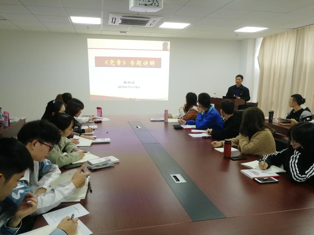 11月16日下午,15vip太阳集团第66期入党积极分子培训班第二讲在东区教学综合楼A1505会议室举行。本次党课由公司党委书记吴太山讲授《党章》专题。院员工党建办主任孙宇涛主持。
