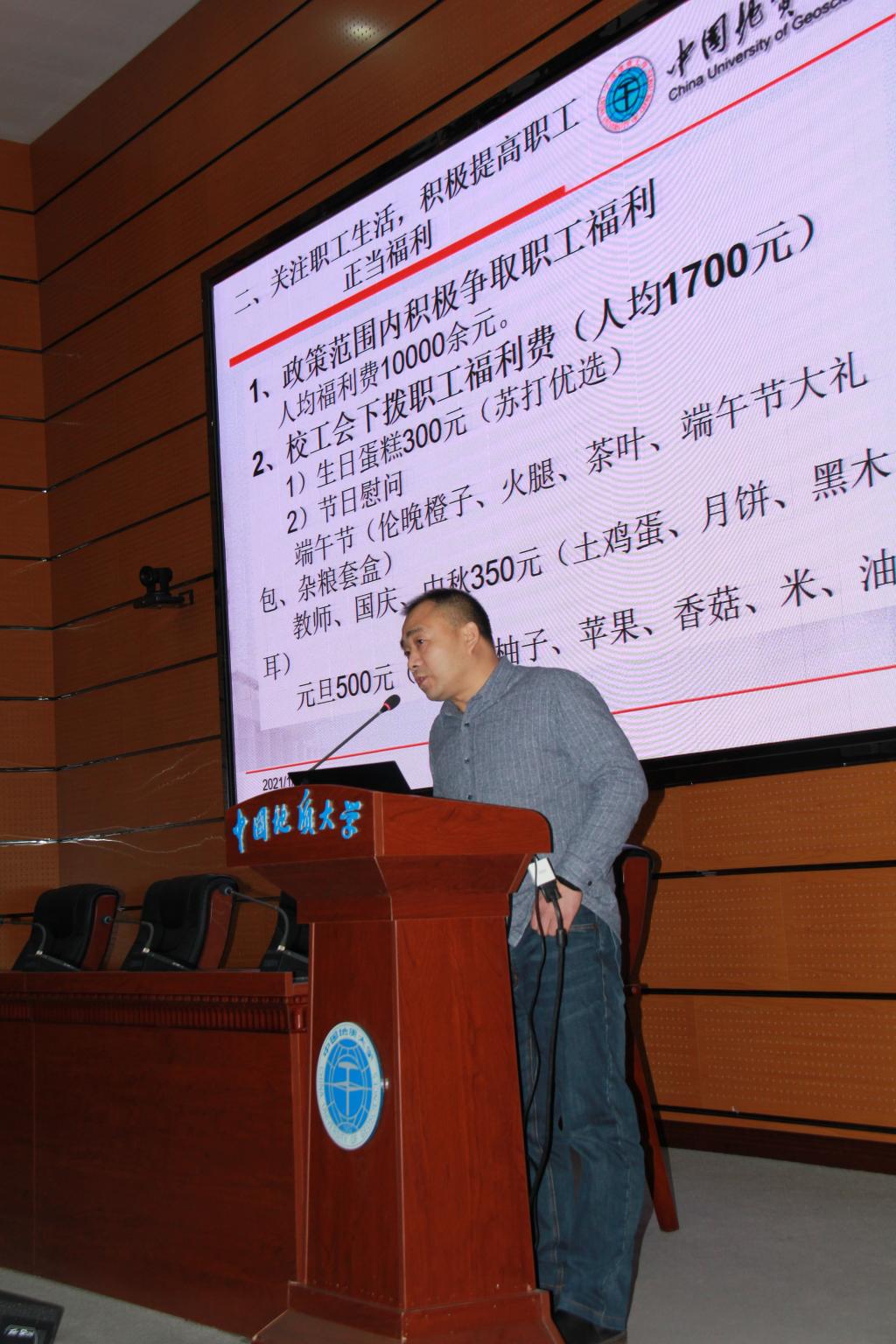 公司分工会主席王希成代表工会委员会做了工会年度工作报告及经费使用说明。他在报告中回顾了2020年工会工作以及公司工会在公司各项比赛中取得的成绩,号召全院教职工和工会会员要认真学习贯彻党的十九大、十九届五中精神,以习近平新时代中国特色社会主义思想为指导,在总结“十三五”成果的基础上,谋划好公司“十四五”规划,充分发挥主人翁精神,弘扬“严在地大”优良传统,抓住机遇,迎难而上,为完善公司治理体系,提高公司治理能力,促进公司各项事业迈上新水平、出现新局面而努力奋斗。