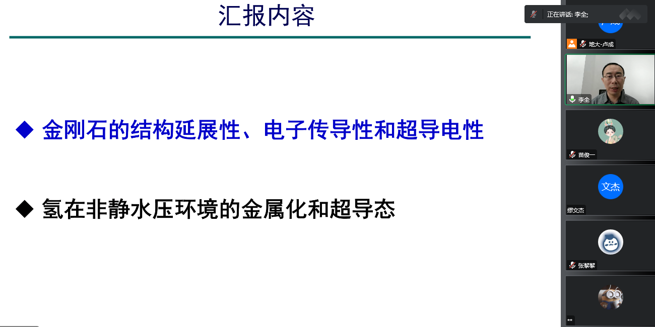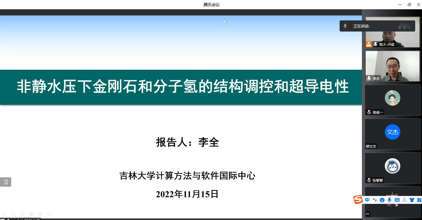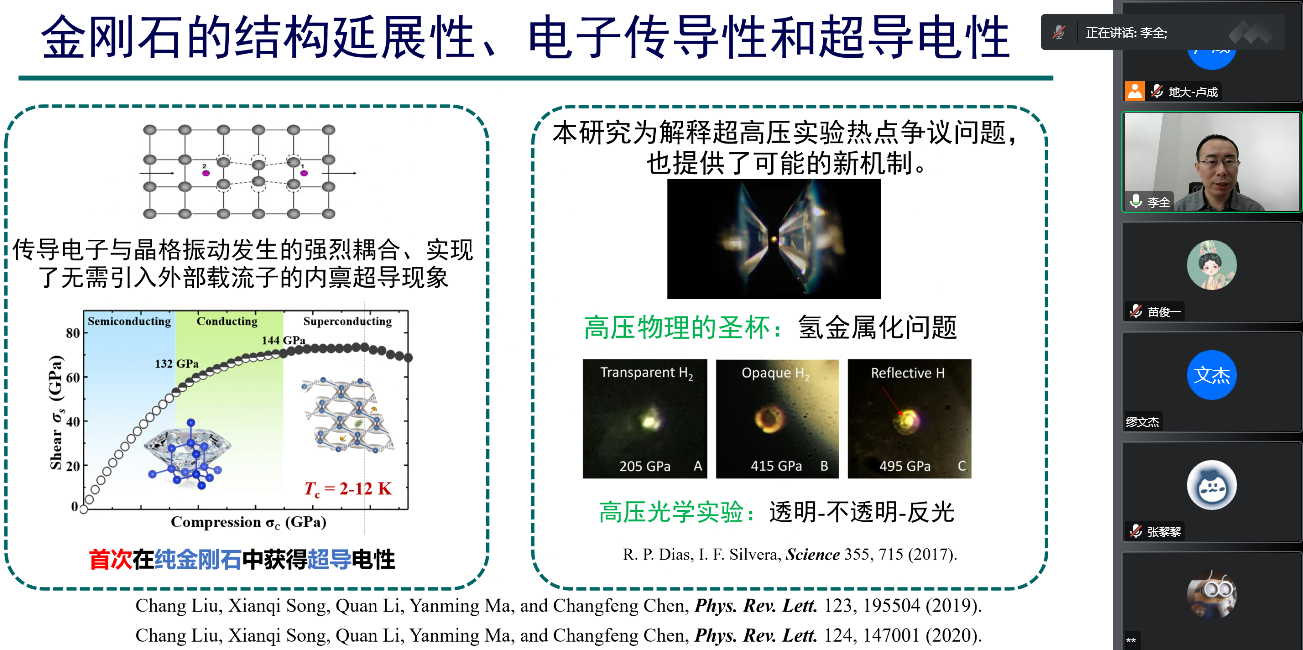 为迎接公司七十周年校庆,11月15日上午,15vip太阳集团通过线上的方式,邀请吉林大学计算方法与软件国际中心李全教授,为公司物理系师生做了题为《非静水压下金刚石和分子氢的结构调控和超导电性》的学术报告。该报告由公司科学技术发展院、15vip太阳集团联合举办,卢成教授主持,本院师生共计60余人参加。