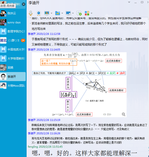 在MOOC背景下,韩老师也非常注重教学研讨,围绕着大学物理MOOC教学,通过QQ群交流教学体会,研讨在线教学中出现的新问题,如:在线教学智慧工具的特点及选用;MOOC教学中应注意的问题;MOOC试题库的建设与优化;MOOC的评价方法等等。在不断的讨论中,完善了MOOC教学资源,梳理了教学中的重难点,提升了青年教师的教学技能水平。