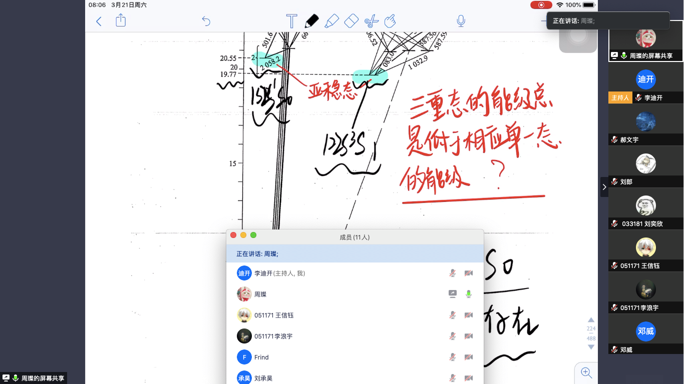 李迪开老师所教的《原子物理》辅修课程,是小班授课,一共只有12名员工,而且是非物理专业的员工,都对物理很感兴趣。原子物理的课程特点是有大量庞杂的知识点,并且这是员工第一次脱离熟悉的经典物理范畴,进入微观物质世界,很多微观物质规律是反直觉的,需要深刻的物理认知能力。以往这类课程,往往需要教师在课堂黑板上进行大量的板书,以阐明公式推导及物理意义,并需要不断跟员工互动,确保员工能够理解并建立物理图像。这对于疫情期间的直播课来说,是个不小的挑战。在新学期伊始,李老师也不确定到底怎样的教学法是最有效的,经过一两周的摸索,李老师尝试将费曼学习法运用于小班教学。费曼学习法指的是,一个人想要学习一种新知识或概念,就在初步学习后,将学到的东西向他人讲授,在讲述过程中,既能加深自己对概念的理解,更能找到自己不明白的知识节点,由此梳理整个知识结构。于是在每次原子物理课前,李老师先将电子版教材,教案,以及Bilibili平台,中国大学MOOC等在线教学视频发布到班级教学QQ群里,给同学们分配任务,每一名或几名同学负责一个小节的“备课”。到了直播课的时候,使用腾讯会议的直播功能,由一名同学向所有同学讲授相应的课程章节。刚开始时,大家都有点不适应这种方法,包括李老师自己心里也没底。有的同学明显准备不充分,就是照着李老师课前发布的课件“念书”。不过李老师马上就发现了一个好的补充方法——提问。讲课的同学,可能对着课件照本宣科地念,但在关键的知识点,李老师会喊停,进行针对性提问“张同学,你刚才说玻尔氢原子轨道解释有不足之处,那么请问你,是哪些不足之处?”,再比如“王同学,你刚才说碱金属原子谱线经过三次分裂,那么是哪三次分裂?”最初这样操作的时候,讲课的同学被问的张口结舌,毕竟像上面关于三次分裂的问题,涉及到前后三章课程的若干个知识点。心理学上人倾向于保持一贯性,也就是要维护自己说出来的话,因此即使员工是仅仅是照着课件念出了某个模糊的概念,当被老师问到的时候,员工的大脑就开始主动思考寻找问题的答案,以便自圆其说。就这么一个让员工备课讲课,再加上老师在直播中现场提问的安排,迅速把老师向员工传授转变成了员工自己要去找到答案。再结合腾讯会议的多人分享屏幕功能,每个员工都充分发挥了各自的聪明才智,利用不同的技术手段向老师同学们展示自己的学习思路。在腾讯会议室中,李老师只是把控进度和关键知识节点的主持人,而员工才是各展其才粉墨登场的主角,充分形成了教师为主导,员工为主体的良性教学互动。