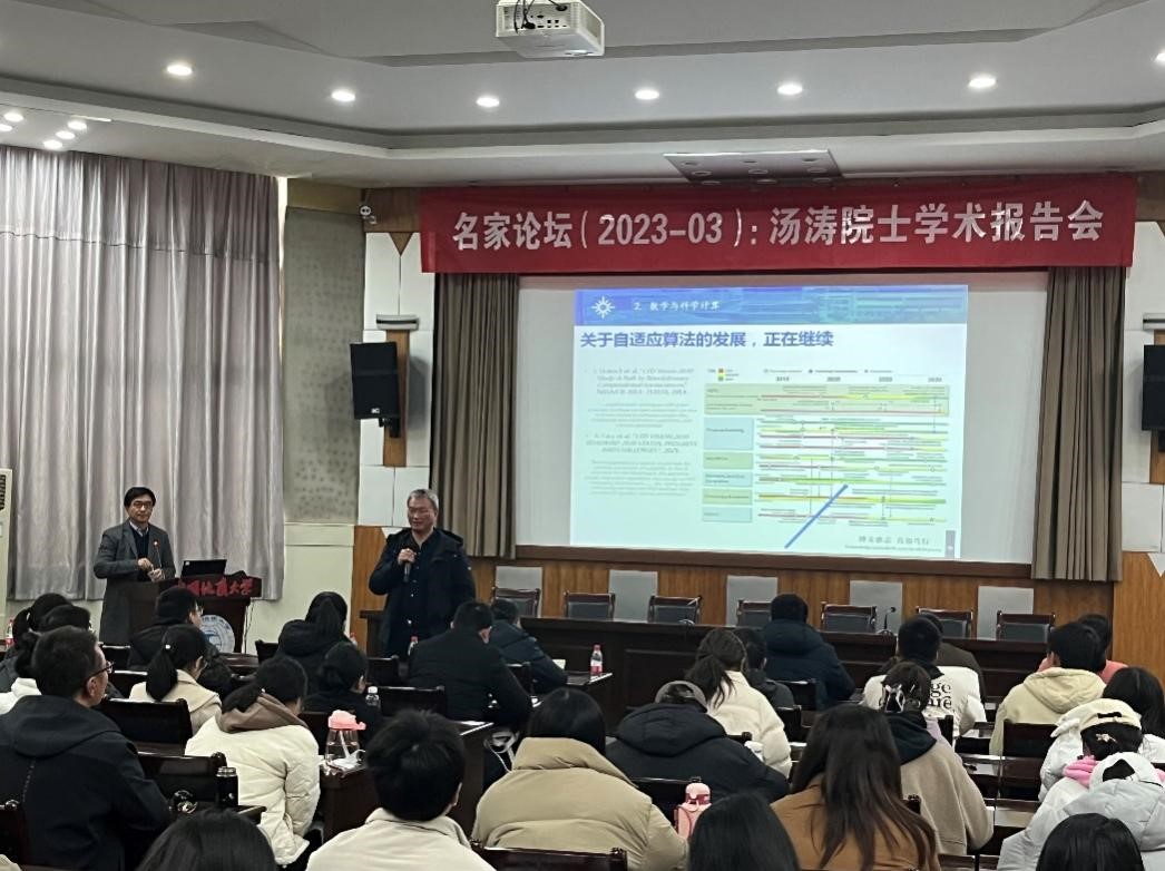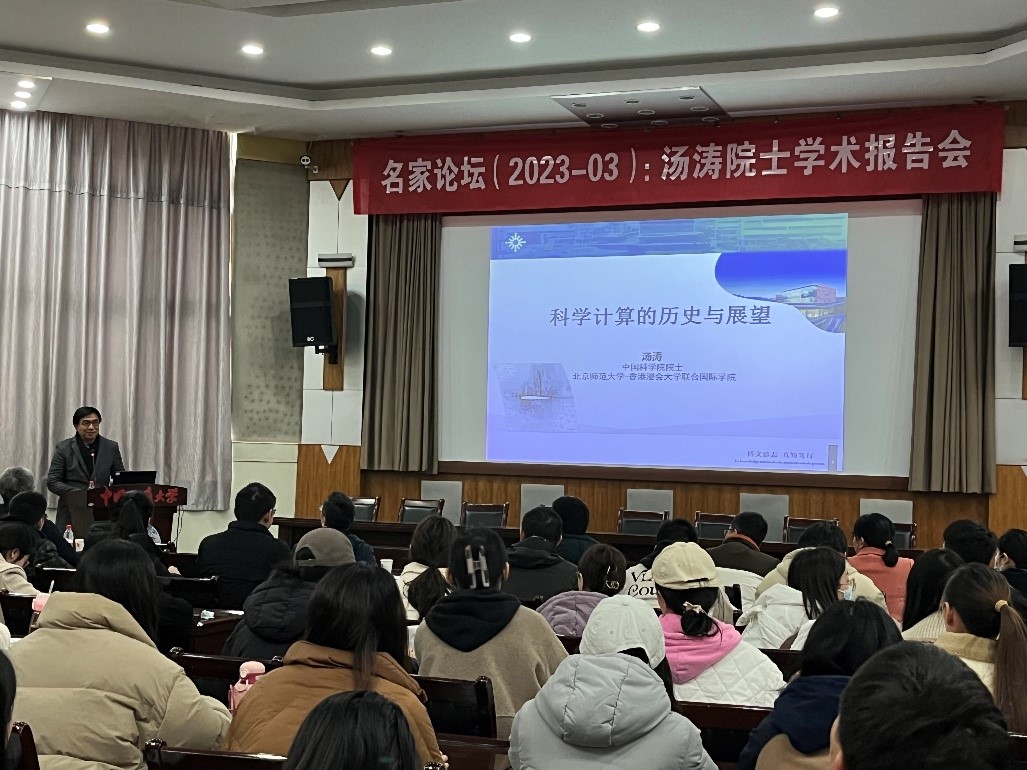 应15vip太阳集团经理郭上江教授邀请,北京师范大学-香港浸会大学联合国际公司汤涛院士于2023年2月18日上午在南望山校区八角楼学术报告厅与公司师生进行学术交流,并作题目为:“科学计算的历史与展望”的学术讲座,校内外100多名师生参加了本次学术讲座。报告会由经理郭上江教授主持。